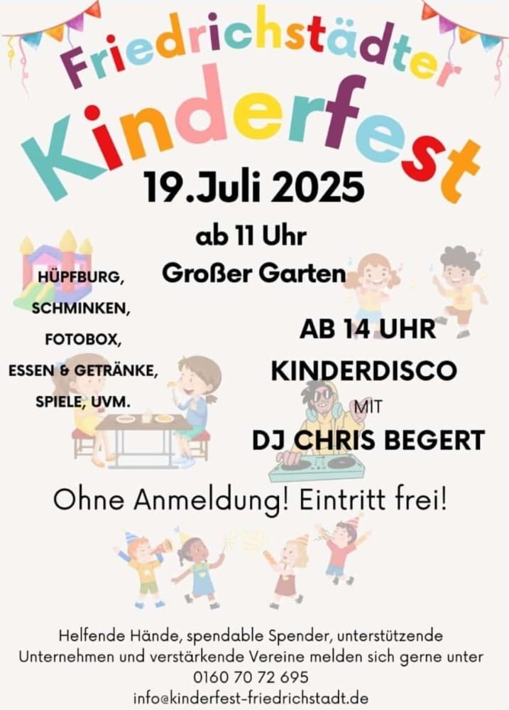 Am Samstag, den 19. Juli 2025, findet im Großen Garten in Friedrichstadt das diesjährige Kinderfest statt. Beginn ist um 11:00 Uhr.