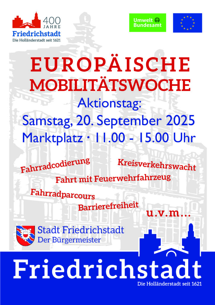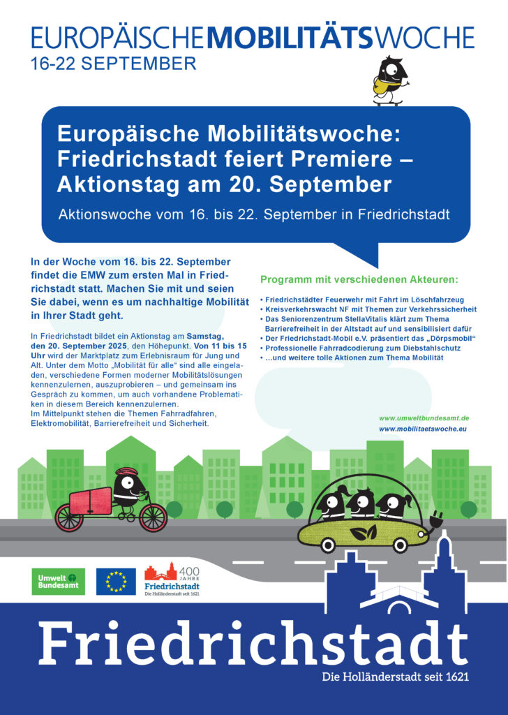 Friedrichstadt beteiligt sich in diesem Jahr erstmals an der Europäischen Mobilitätswoche. Ziel der europaweiten Aktion ist es, nachhaltige und sichere Mobilität erlebbar zu machen. Höhepunkt ist der große Aktionstag am Samstag, 20. September 2025, von 11 bis 15 Uhr auf dem Marktplatz.